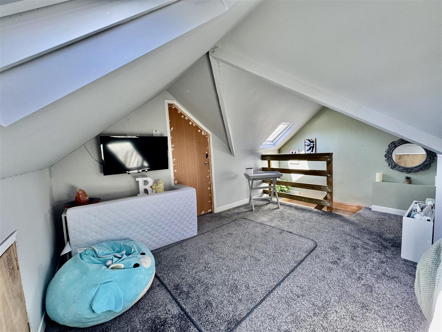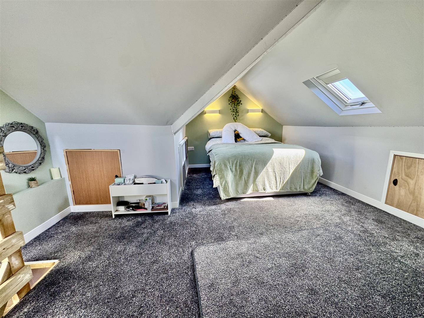Three velux rooflight. Door to loft store area. Eaves storage cupboards.