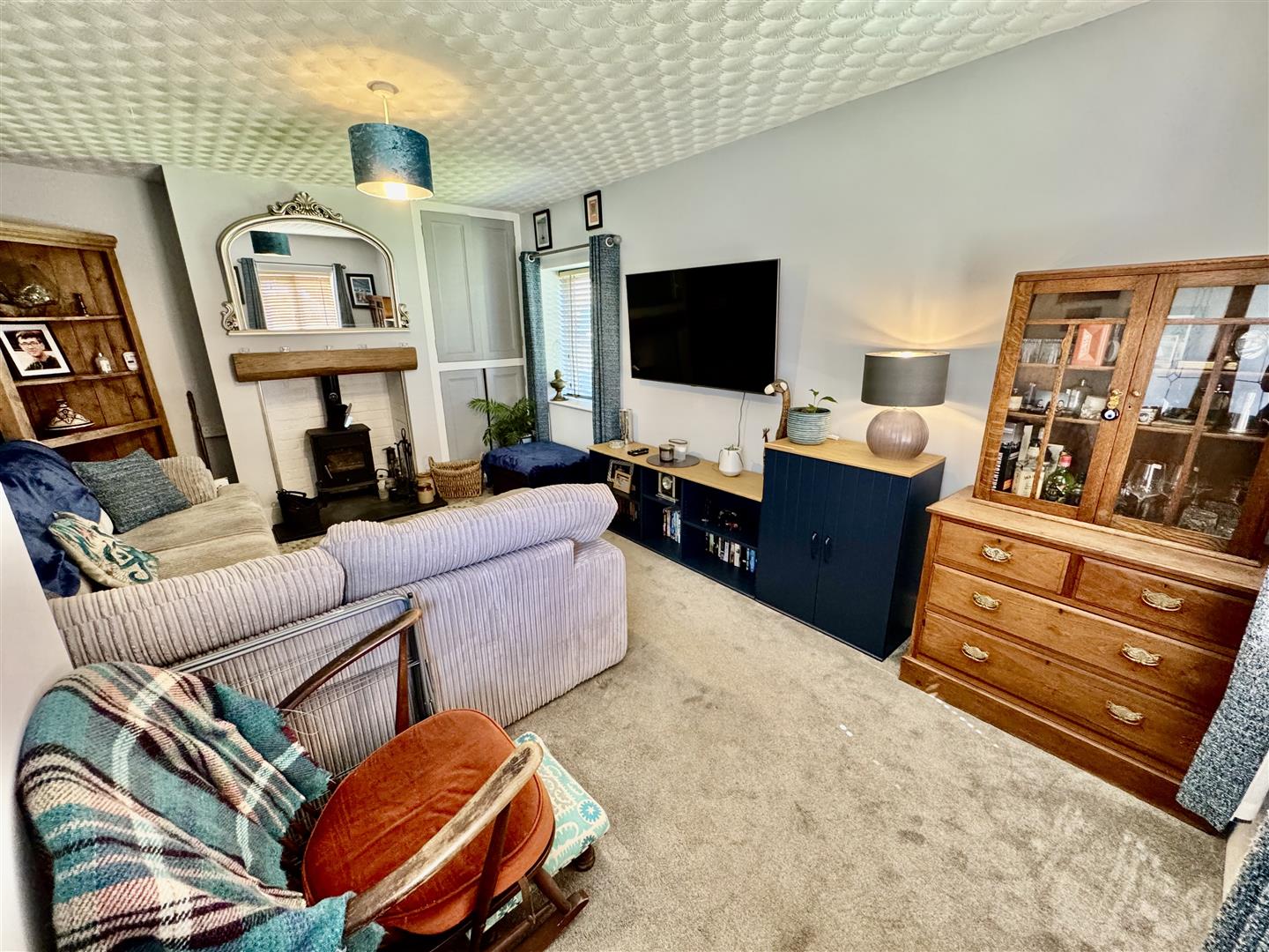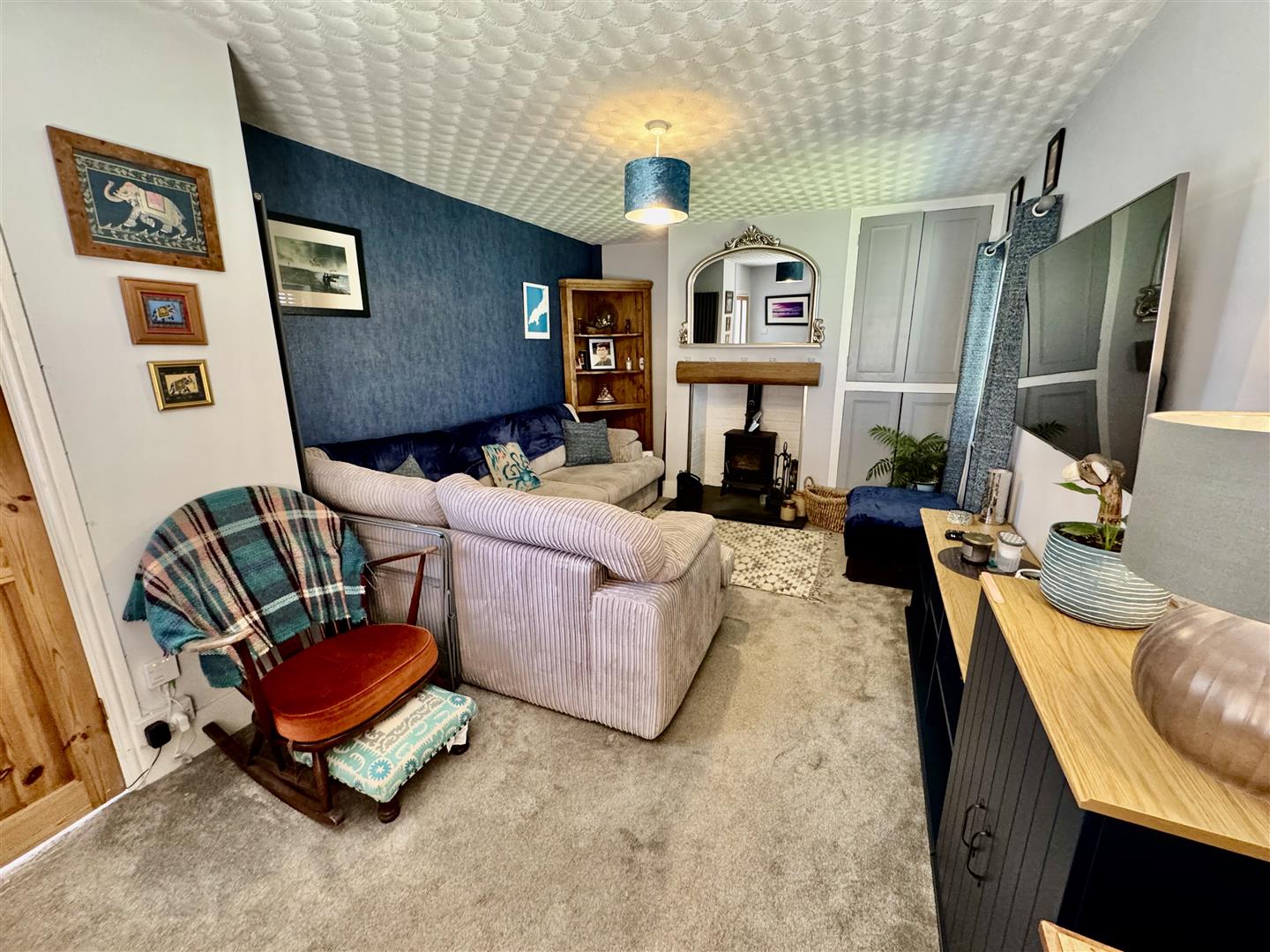 Multi fuel stove set on slate hearth. Vertical radiator. Cupboard in alcove.