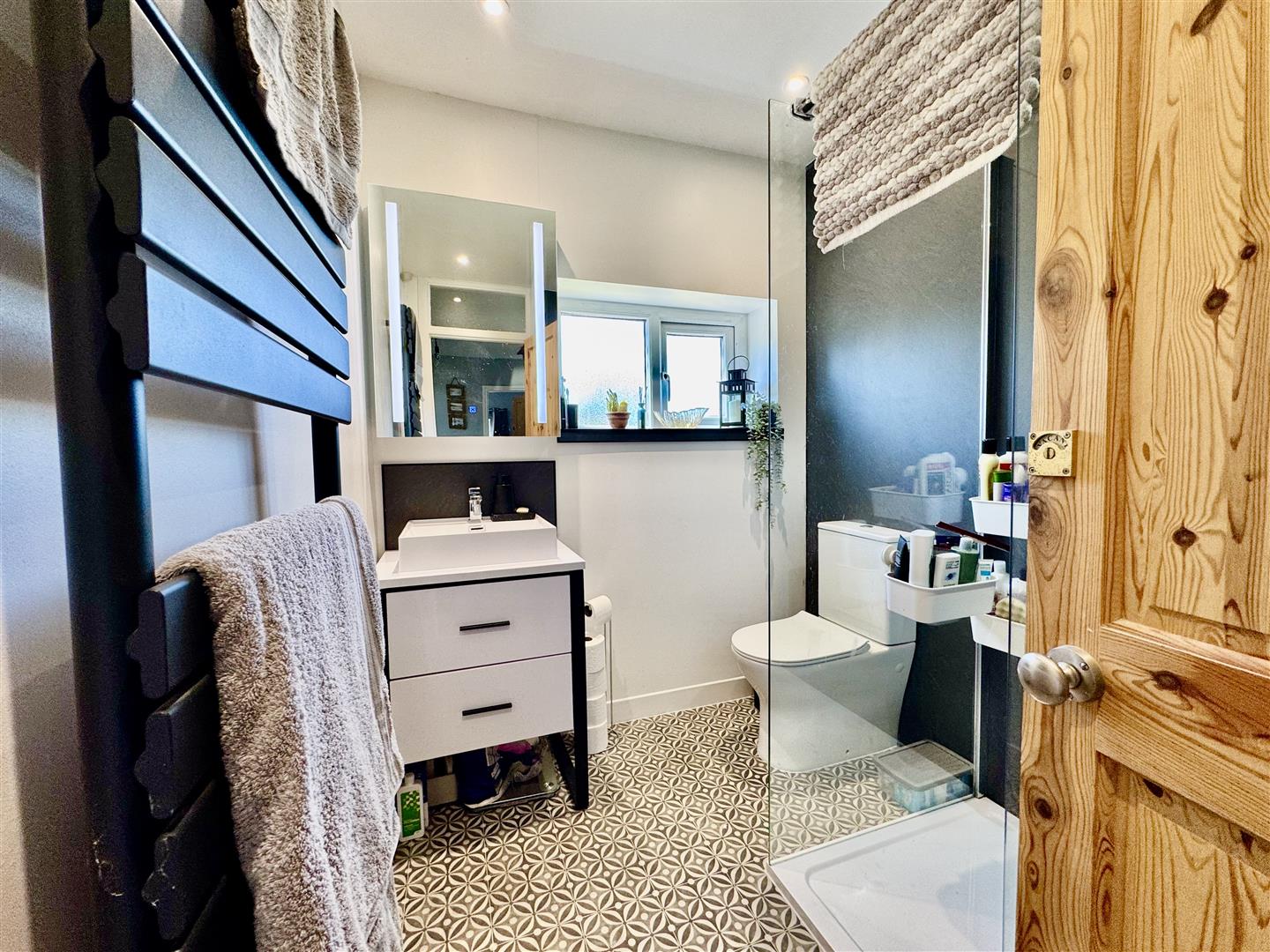 Modern suite comprising walk-in shower cubicle. Low level w.c. Vanity washbasin. Towel radiator.