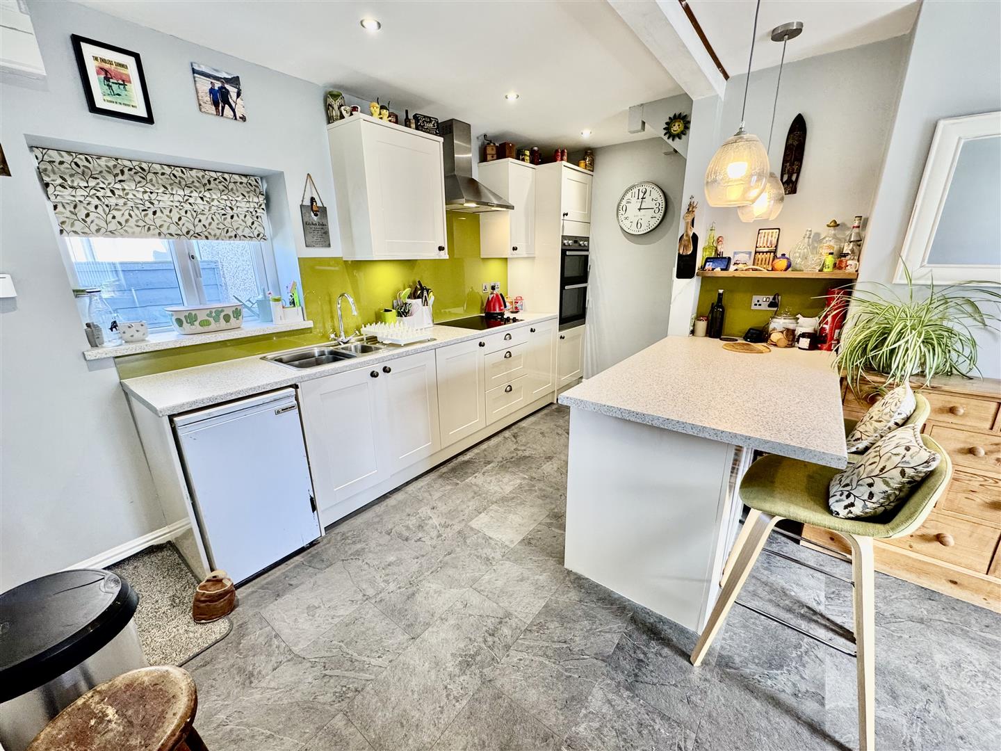 Maximum measurements to under stairs area. Modern kitchen unit comprising one and a half bowl stainless steel sink unit. Induction Hob with extractor hood over. Double oven. Oil boiler for central heating and hot water. Outside door to: