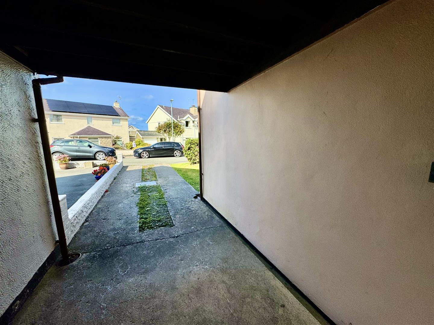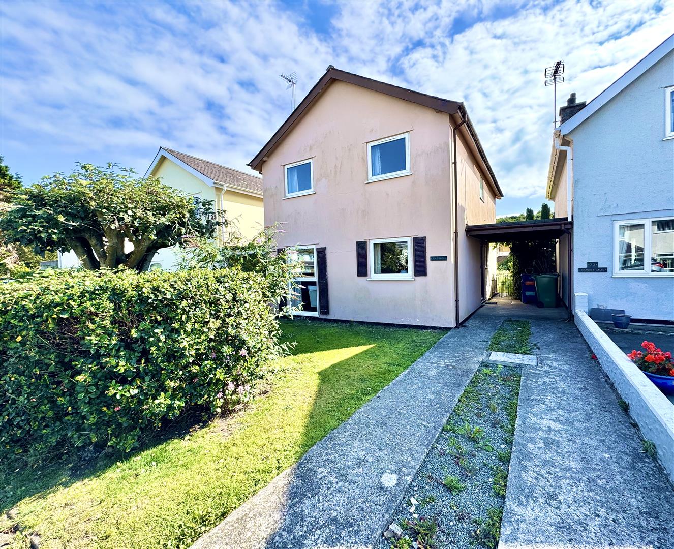 Spacious driveway with carport and parking to the side. Front garden with side access leading to enclosed rear garden. Garden shed.
