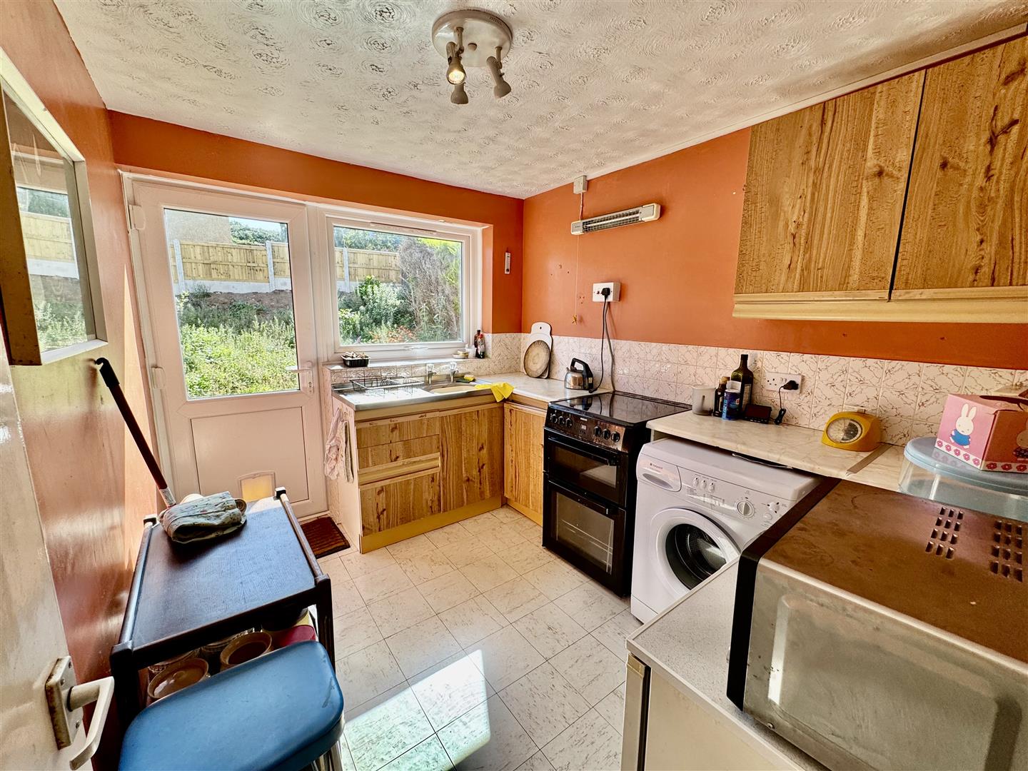 Kitchen units incorporating single drainer stainless steel sink unit. Plumbing for washing machine. Space for oven. Outside door to rear garden.