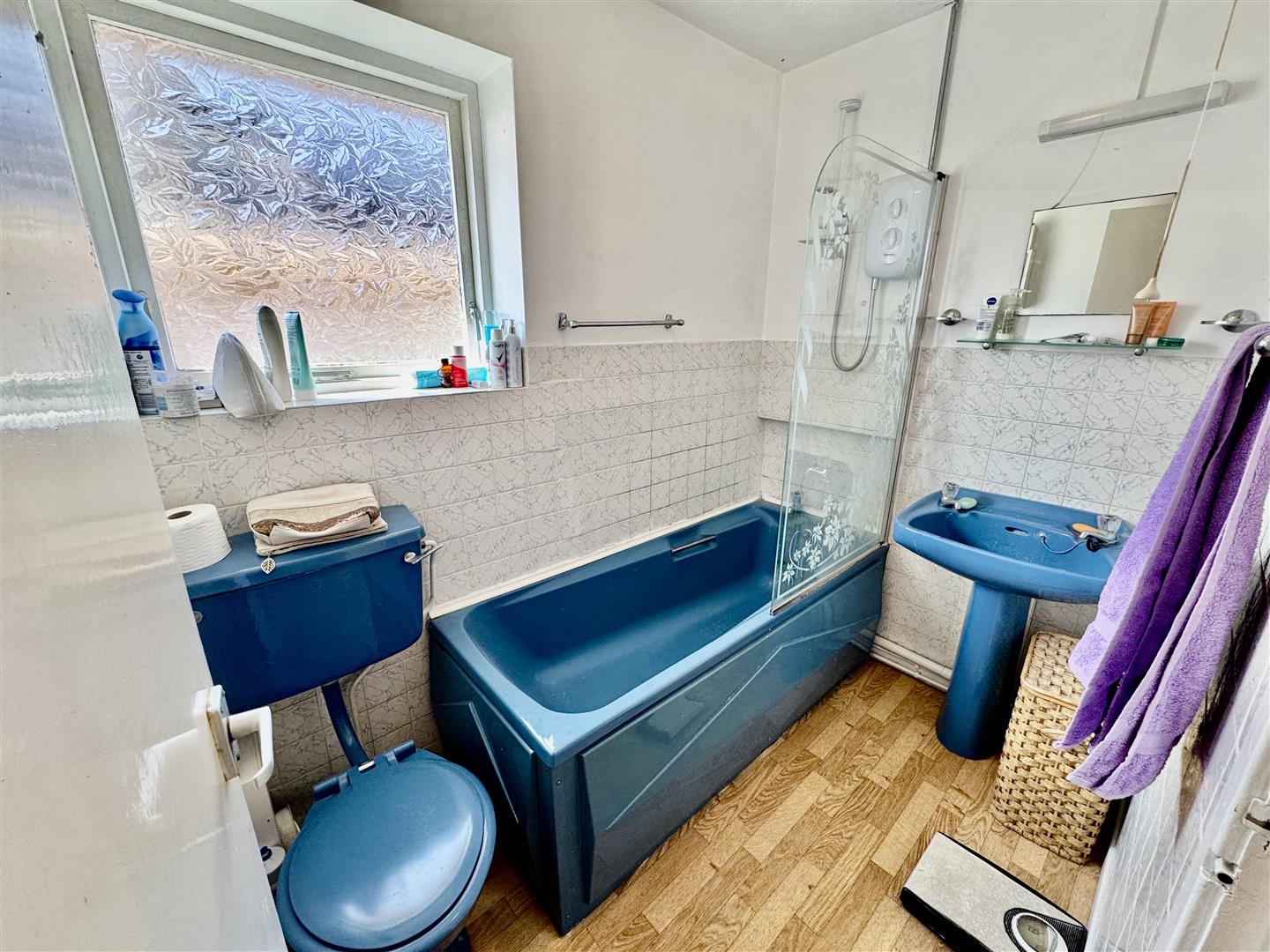 Low level w.c. Pedestal washbasin. Panelled bath with electric shower over.