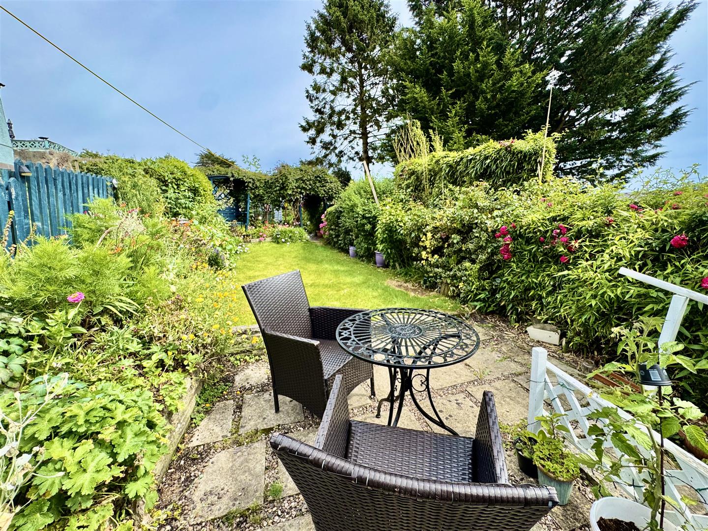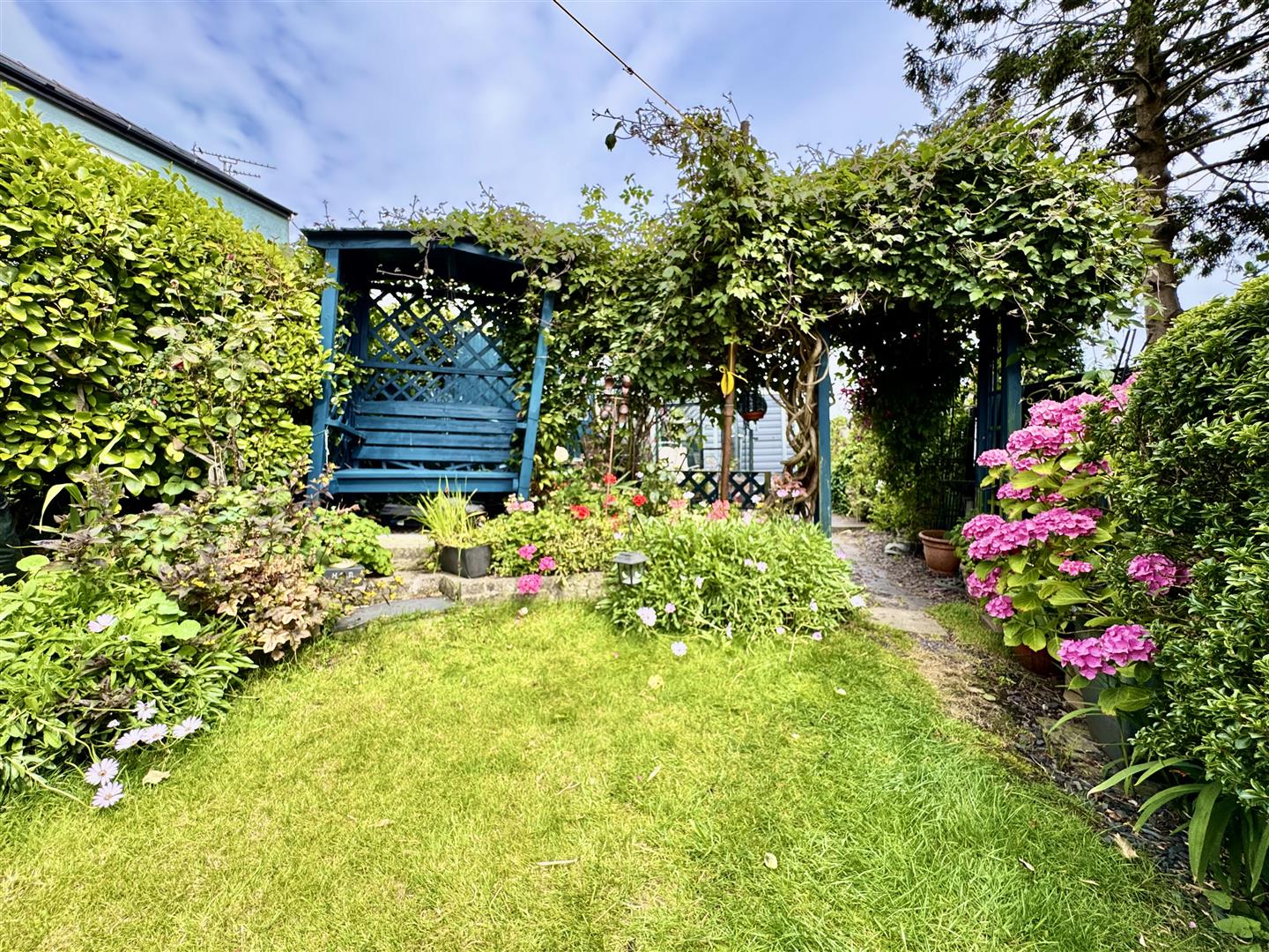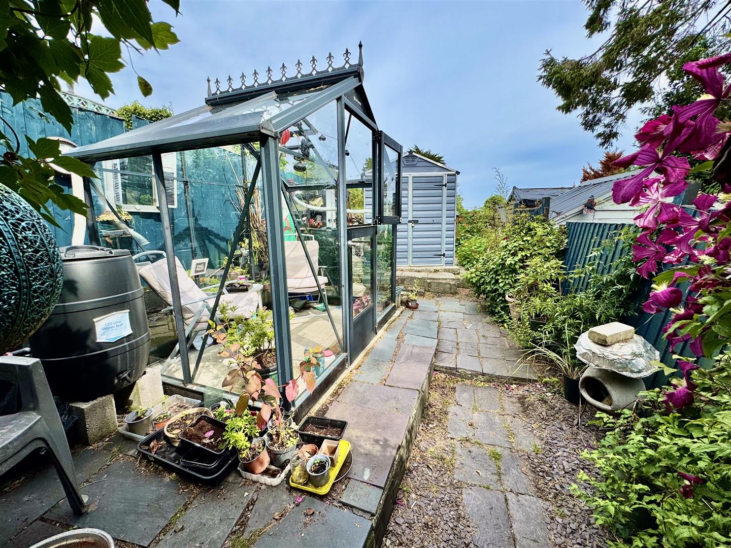 Iard gefn gyda grisiau i fyny at ardd deras. Sied ardd. (Heb gynnwys ty gwydr).