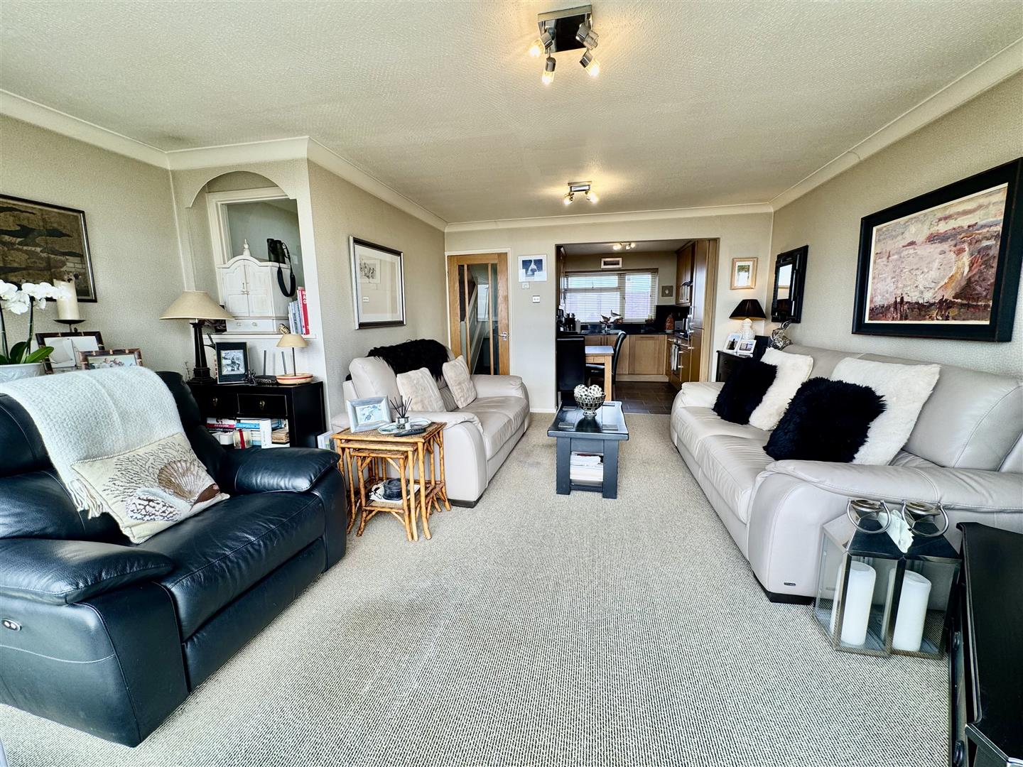 Maximum measurements. 'L' shaped room. Triple Glazed UPVC patio door to south facing balcony (fitted in 2024), enjoying spectacular views encompassing Llanbedrog headland to St Tudwals Islands, the mountains of Mid Wales and all of Cardigan Bay. Three radiators. Opening to: