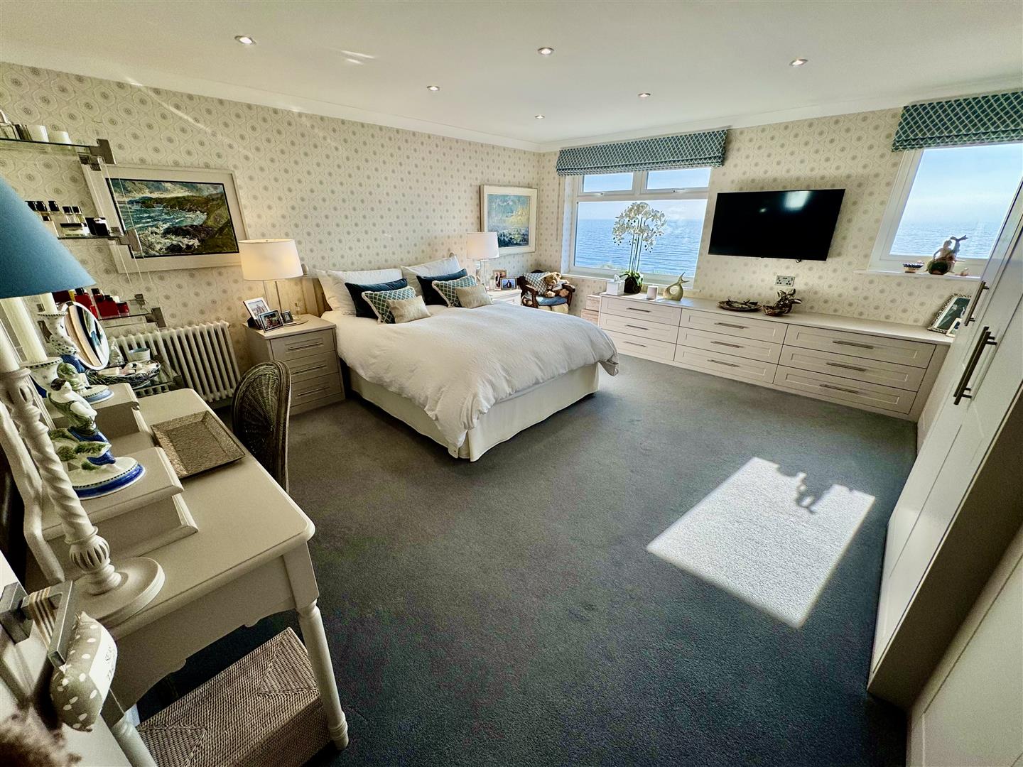 Spectacular sea views. Built in wardrobes and drawers. Two radiators. Door to: