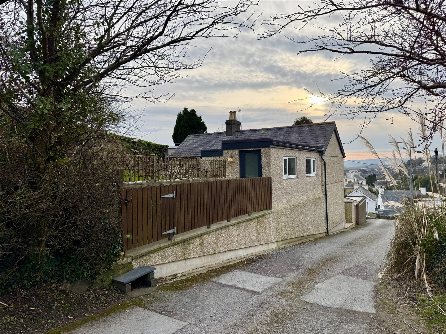 Paved patio area to the front with steps leading up to patio & lawn garden at the rear with a glimpse of the sea to be seen in the distance. The parking space on opposite side of the lane is included (greenhouse not included) - Plan to follow.